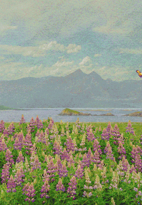 Before him, a meadow cascaded toward the sea in waves of color so startling it seemed stolen from someone else's memory—certainly not his, which had been filing everything under grey for longer than he cared to admit. Lupines. Thousands upon thousands of them, their purple and lilac spires swaying like a congregation mid-hymn. Beyond them, the water lay still as hammered steel, and small islands rested on its surface with the infinite patience of sleeping leviathans. Mountains watched from their ancient posts, their peaks softened by clouds that promised rain but delivered only witness.